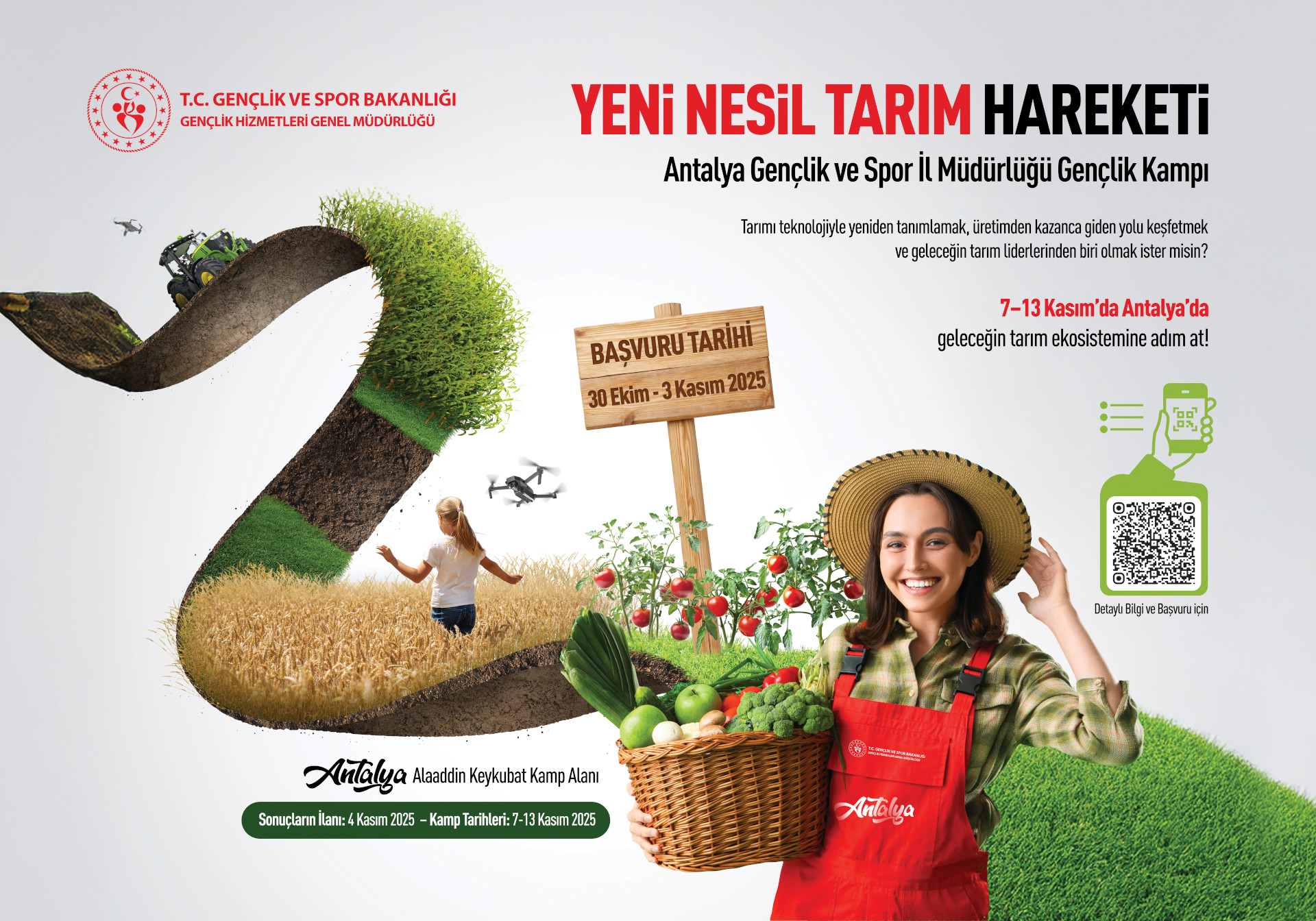 Gençlik ve Spor Bakanlığı Gençlik Hizmetleri Genel Müdürlüğü tarafından gençlere tarım sektörünün yenilikçi yönleri ile tanıtılması ve tarımsal faaliyetlere yönelik farkındalık oluşturulması amacıyla 14-18 yaş grubu gençler için Yeni Nesil Gençlik ve Tarım Kampı 07-13 Kasım 2025 tarihlerinde ilimizde yapılacak. Son başvuru tarihi 03 Kasım 2025 olup, sonuçlar 04 Kasım 2025 günü ilan edilecek.